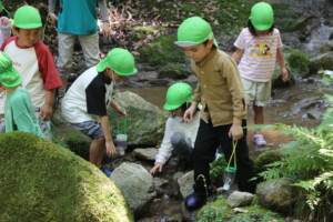 1日目は油山へ川遊びに出かけ、おうちの人と作った自分だけの水遊びグッズを持って