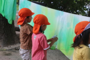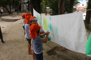 さらに、この日はおとぎの森のおまつり(運動会)で使う大きな布を、みんなで染める活動もしました。風に吹かれた鮮やかな色の布を見て「きれいだね」と目を輝かせる姿がとても印象的でした。