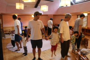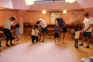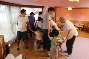 最初は室内で、親子触れ合い遊び《なべなべそこぬけ》をしました。最初は親子で行い、その後は2組3組と人数を増やして最後は皆で一つの輪になりました。